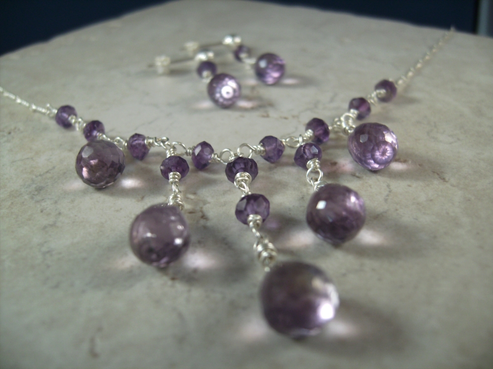 Microfaceted Amethyst gems and briolette drops combined with Sterling wraps and chain make up this exquisite set